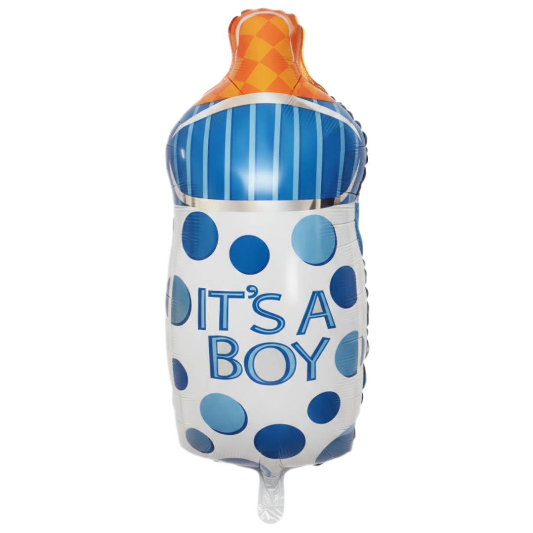 This is an “It’s a Boy” baby bottle foil balloon, a popular decoration for baby showers, maternity photoshoots, and welcoming a new baby boy.