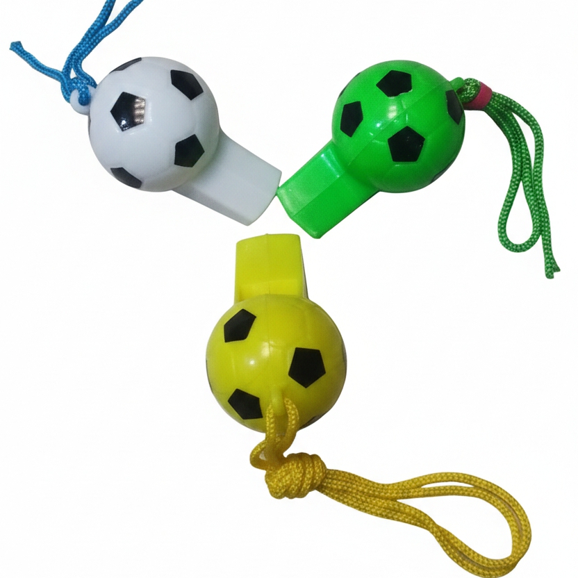 These items are soccer-themed plastic whistles, as party favors or for children’s games.