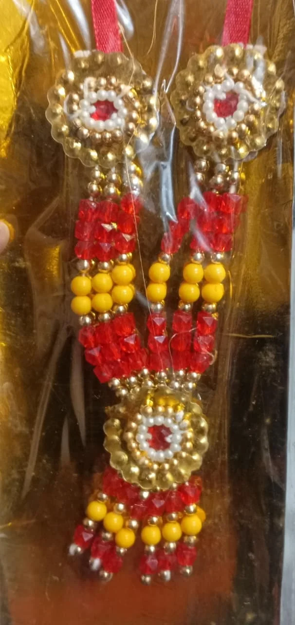 This item is a traditional yellow and red beaded garland necklace or “moti mala”, commonly used as a decorative accessory for religious idols (known as “paan haar”).
